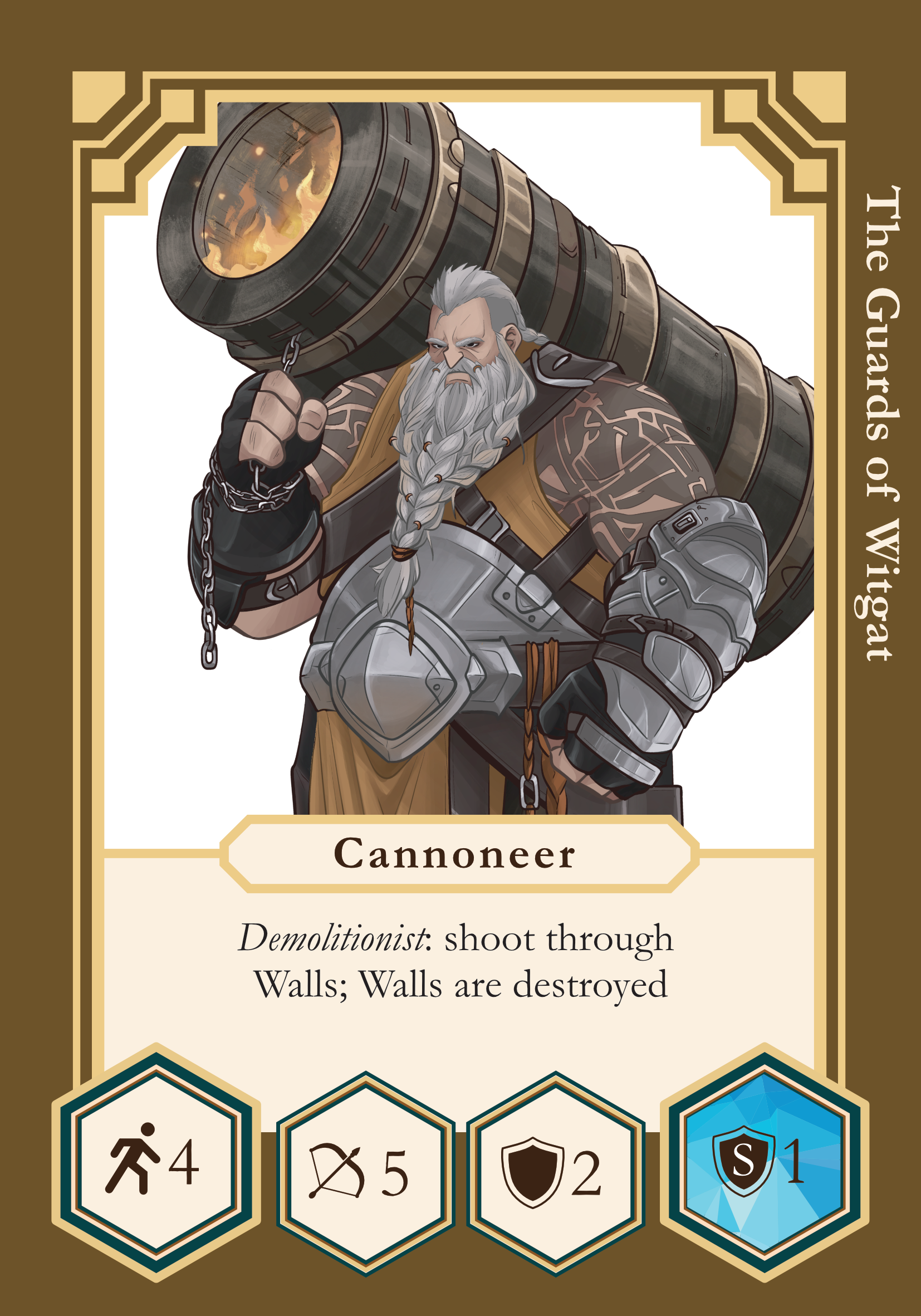 - The Cannoneer's ranged attacks pierce through Walls in any ranged attack scenario: e.g., during the activation, or while performing the Reflex move.