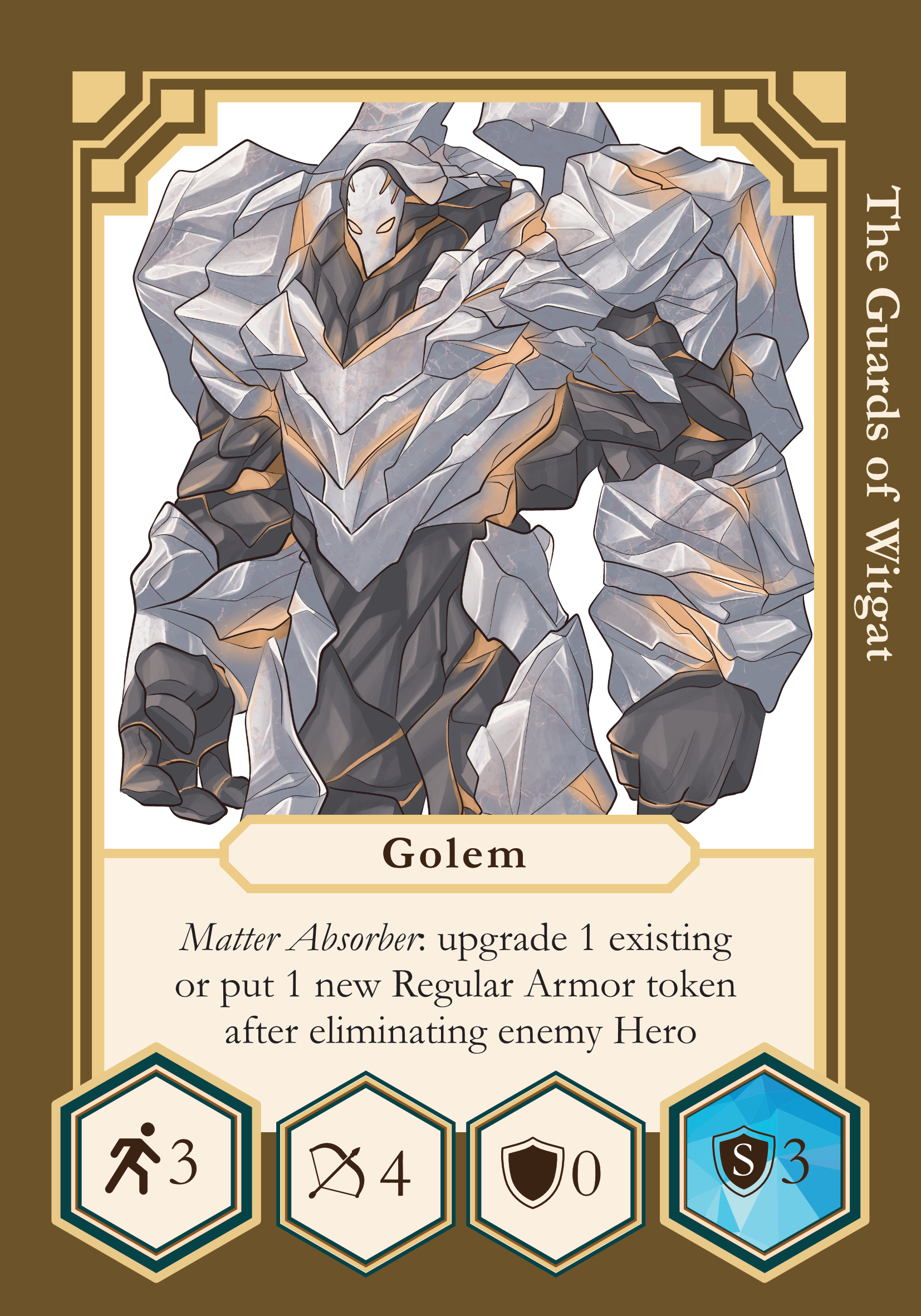 - After Golem eliminates enemy Hero, he can either add 1 Regular armor token to any side of his base without armor, or swap one existing Regular armor token for a Superior armor token.