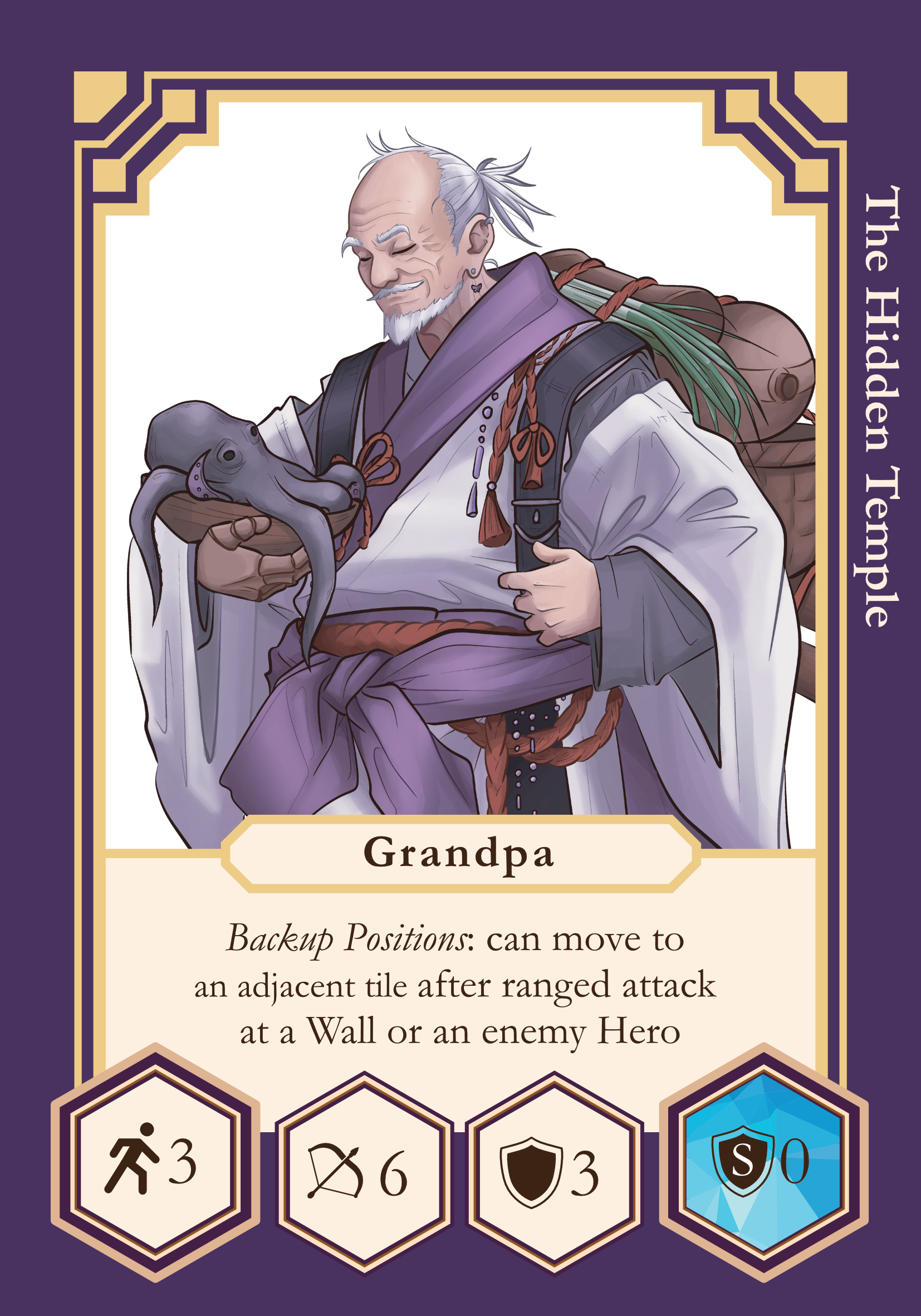 - After Grandpa makes a ranged attack and hits either a Wall or enemy Hero, he can make a move to an adjacent tile and turn.