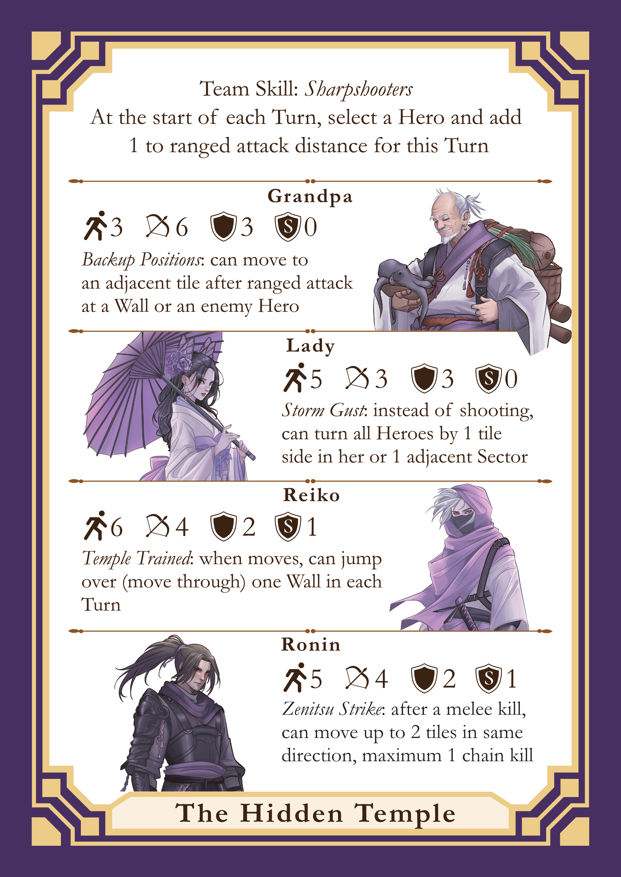 - At the start of each Turn, the Hidden Temple player can choose any Hero on the board and increase that Hero's ranged attack distance by 1.