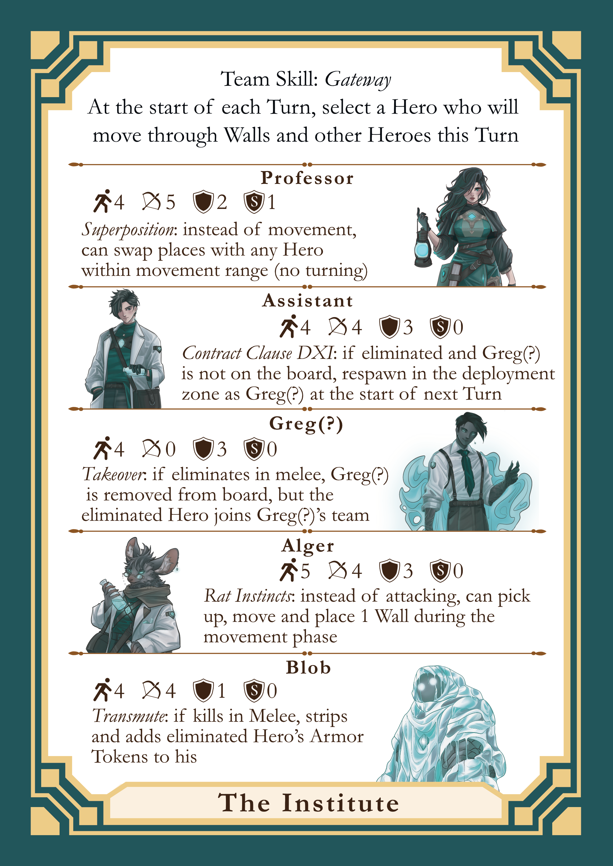 - At the start of each Turn, the Institute player can choose any Hero on the board and allow that Hero to move through the Walls and other Heroes for 1 Turn.